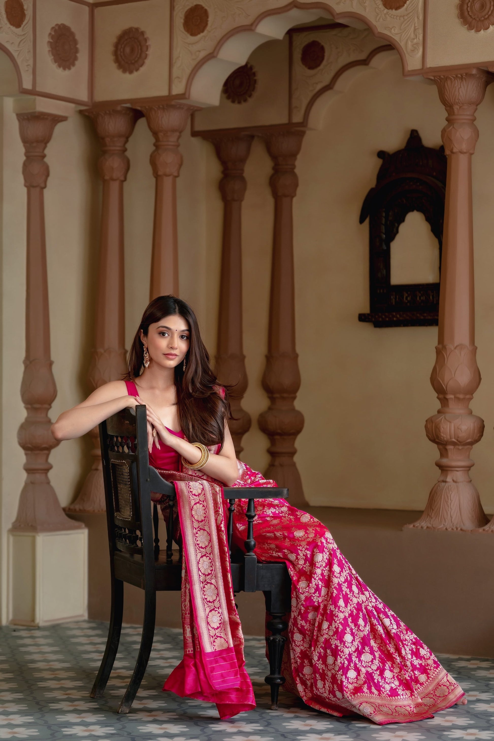 Hand woven by Banarasi weavers with Pure Katan Silk, also known as Banarasi Silk.